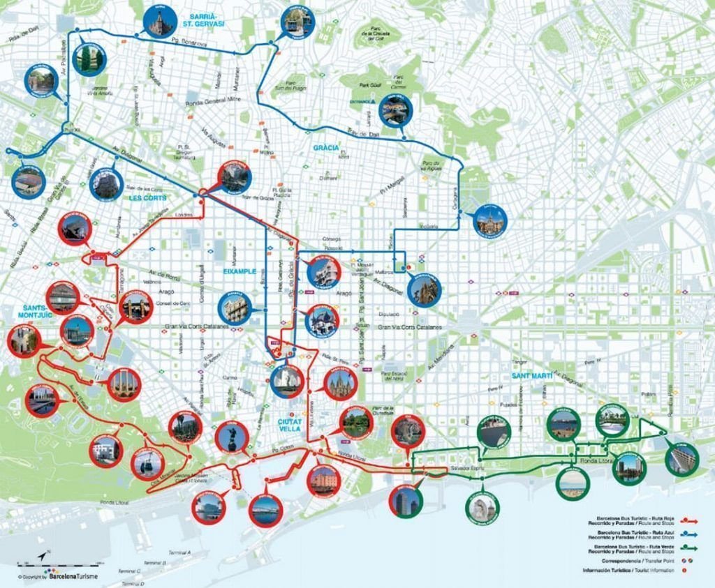 No caso do Ônibus Turístico de Barcelona, cada um de seus 45 paradas em três linhas eles correspondem a uma ou mais das principais atrações de Barcelona.